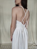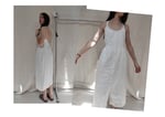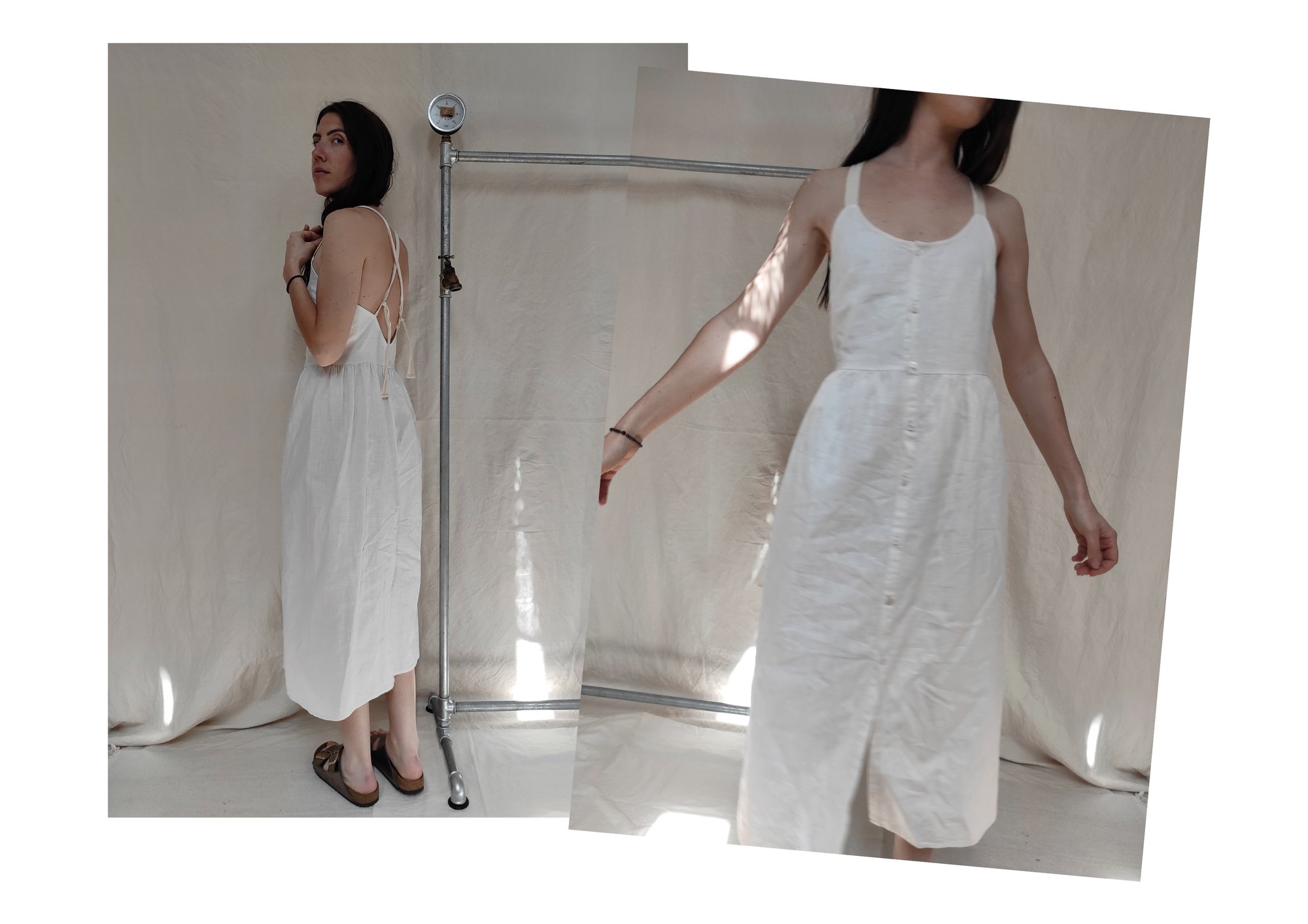 Cette robe est écru, a deux bretelles réglables et se ferme sur le devant avec des boutons en nacre.