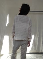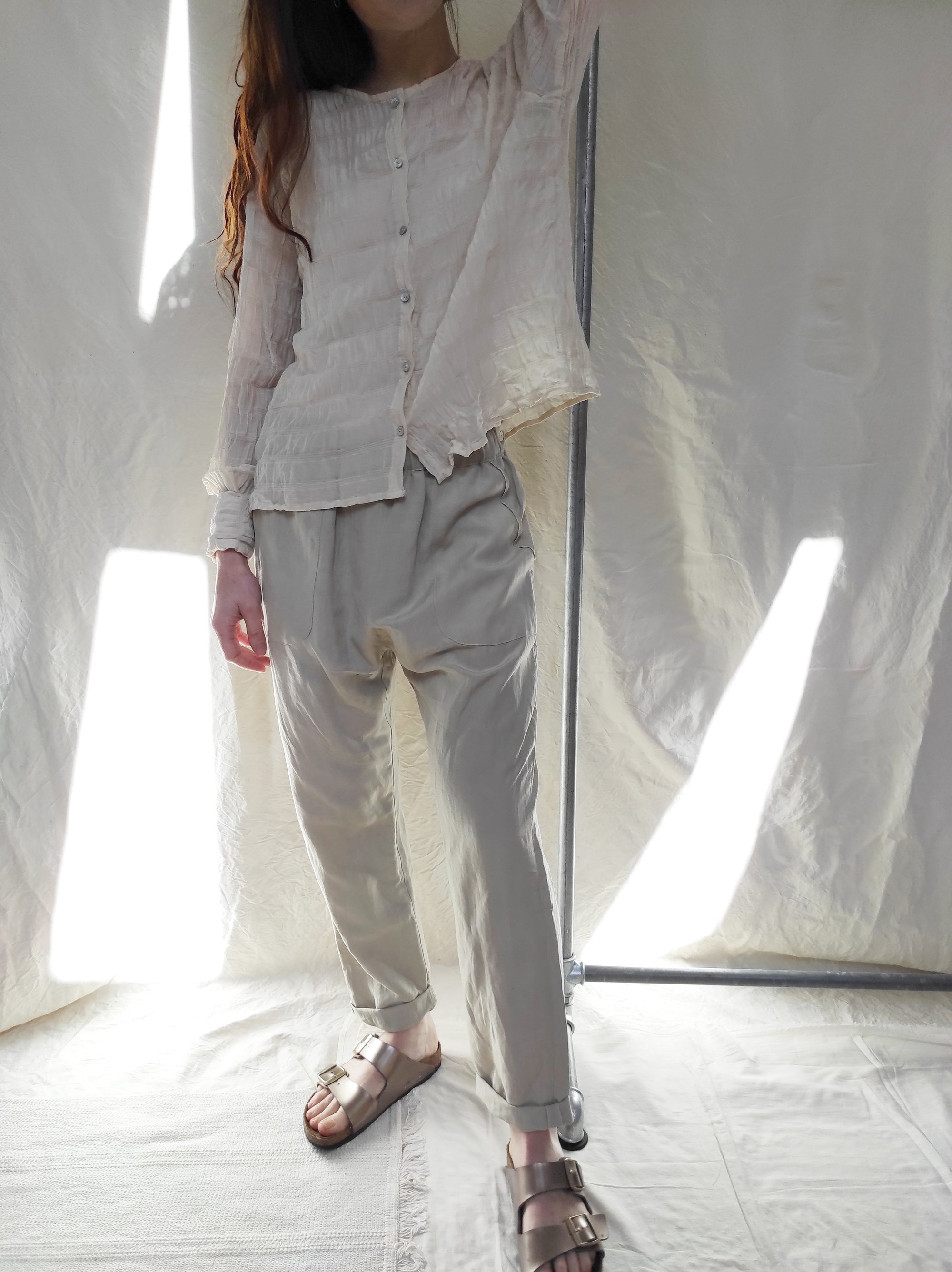 Ce top à une coupe large et fluide, avec des petits plis en bas de manche. Elle se ferme grâce à des boutons en nacrés.