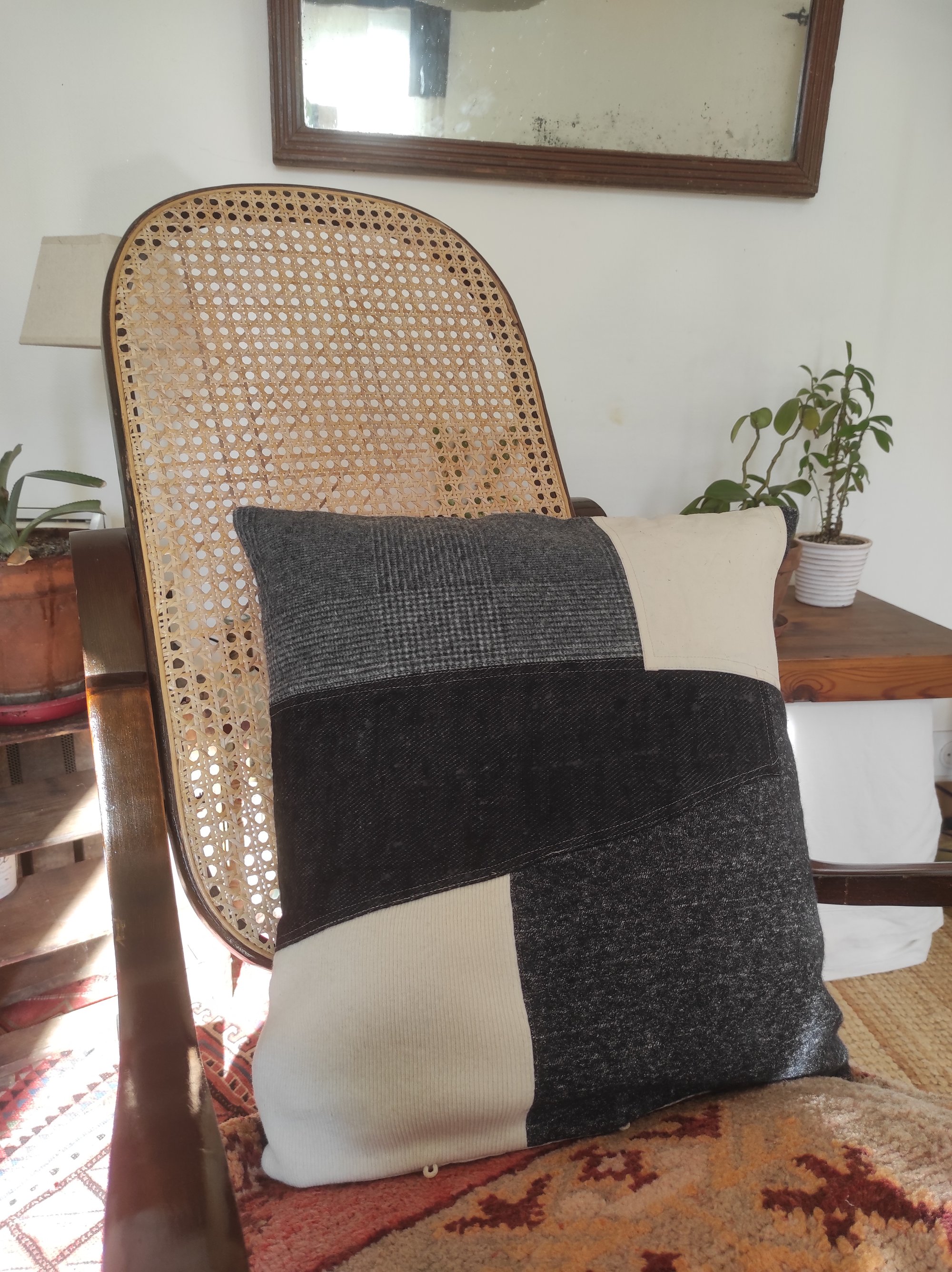 Elle est composée d'un patchwork de tissu issu de l'upcycling, tissus chinés en brocante, chutes de matières d'anciennes collections...