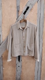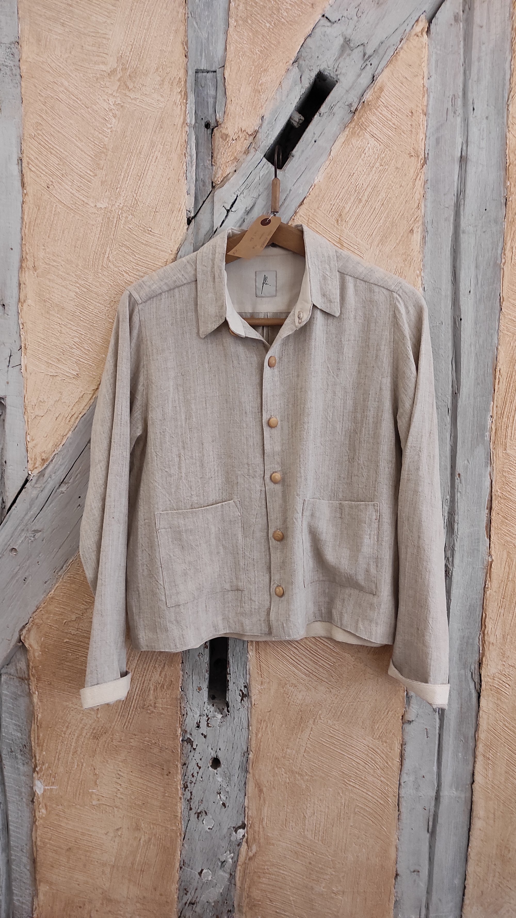 La veste ou chemise en lin et ses finitions en toile de coton, a deux petites poches sur le devant. Elle est très légère et est réalisée avec des matières issues de destockage.